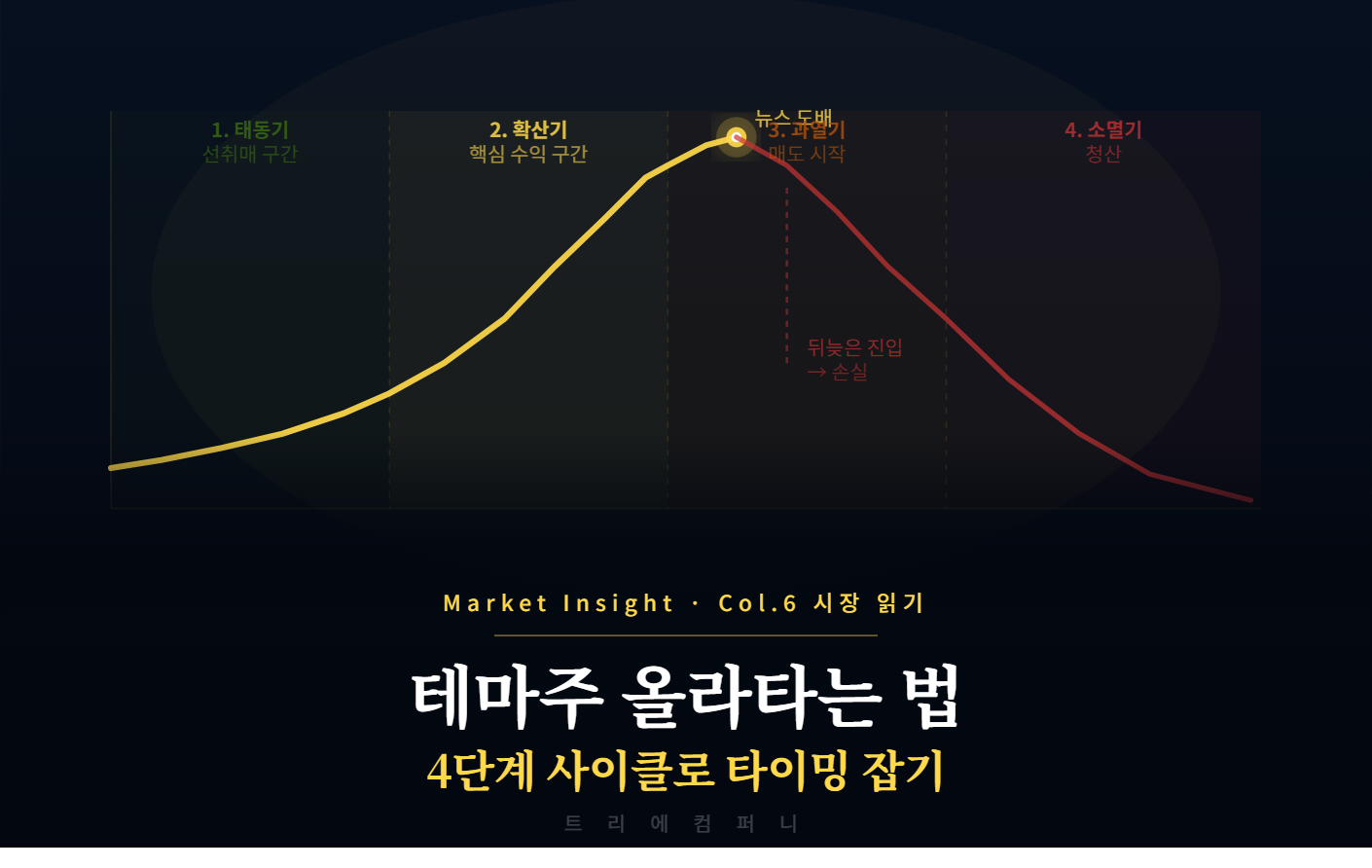 Market Insight · Col.6 시장 읽기테마주 올라타는 법언제 들어가고, 얼마나 들고 있고, 언제 내려야 하는가. 테마주로 수익 내는 사람들이 지키는 4단계 사이클트리에컴퍼니 Market Insight — 시장 칼럼 읽는 시간 약 5분테마주 올라타는 법을 아는 것과 모르는 것은 결과가 완전히 다릅니다. AI, 2차전지, 바이오, 방산 — 테마주는 짧은 시간에 큰 수익을 줄 수 있습니다. 하지만 테마의 흐름을 모르고 뒤늦게 올라타면, 같은 종목에서 누군가는 100%를 버는 동안 나는 -40%를 맞습니다. 테마주는 타이밍이 전부입니다.✦테마주는 왜 만들어지고, 왜 사라지는가테마주는 특정 이슈나 정책, 기술 트렌드에 대한 기대감으로 만들어집니다. 실제 실적이나 매출이 아닙니다. 기대감이 커지면 주가..