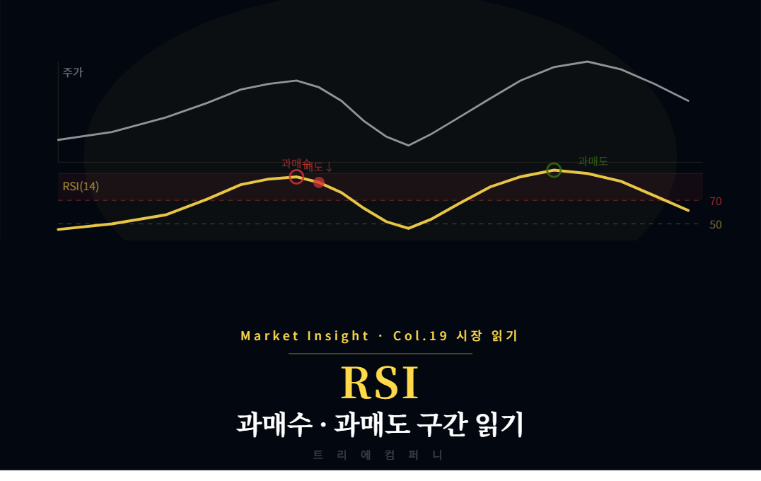 Market Insight · Col.19 시장 읽기RSI 보는 법과매수·과매도 구간을 수치로 보여주는 지표. RSI를 이해하면 진입 타이밍의 힌트를 얻을 수 있다트리에컴퍼니 Market Insight — 시장 칼럼 읽는 시간 약 5분RSI 보는 법을 알면 주가가 너무 많이 올랐는지, 너무 많이 내렸는지를 수치로 판단할 수 있습니다. 주가는 오를 때 계속 오르고 내릴 때 계속 내리는 경향이 있지만, 어느 시점에서는 반드시 과열이 식고 반전이 옵니다. RSI는 그 과열 수준을 0~100 사이의 숫자로 보여주는 지표입니다.✦RSI란 무엇인가RSI(Relative Strength Index, 상대강도지수)는 특정 기간 동안 주가가 오른 날의 상승폭과 내린 날의 하락폭을 비교해 0~100 사이로 나타낸 지표입니..