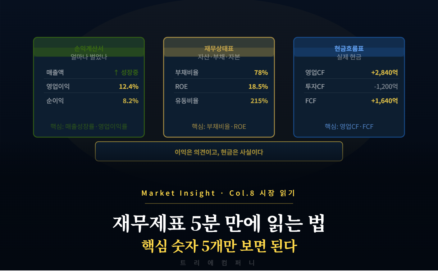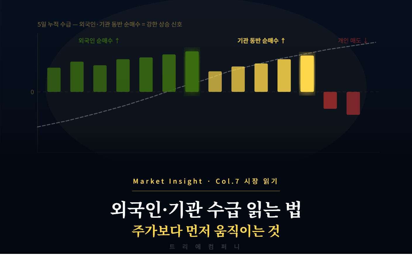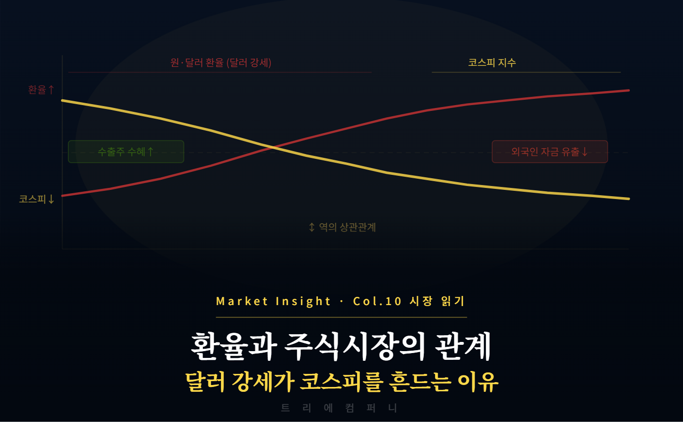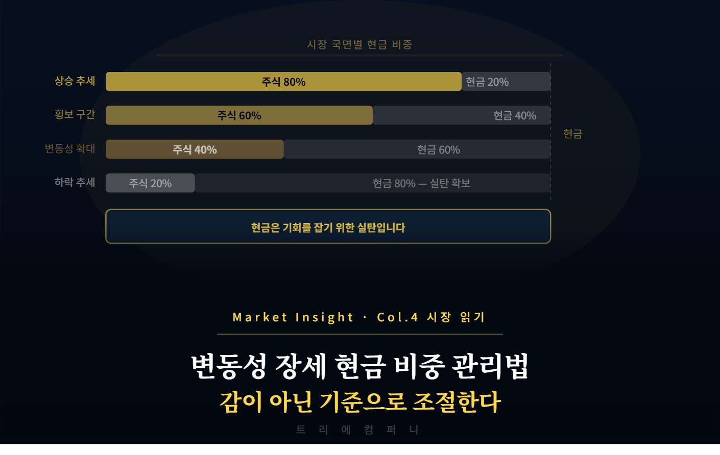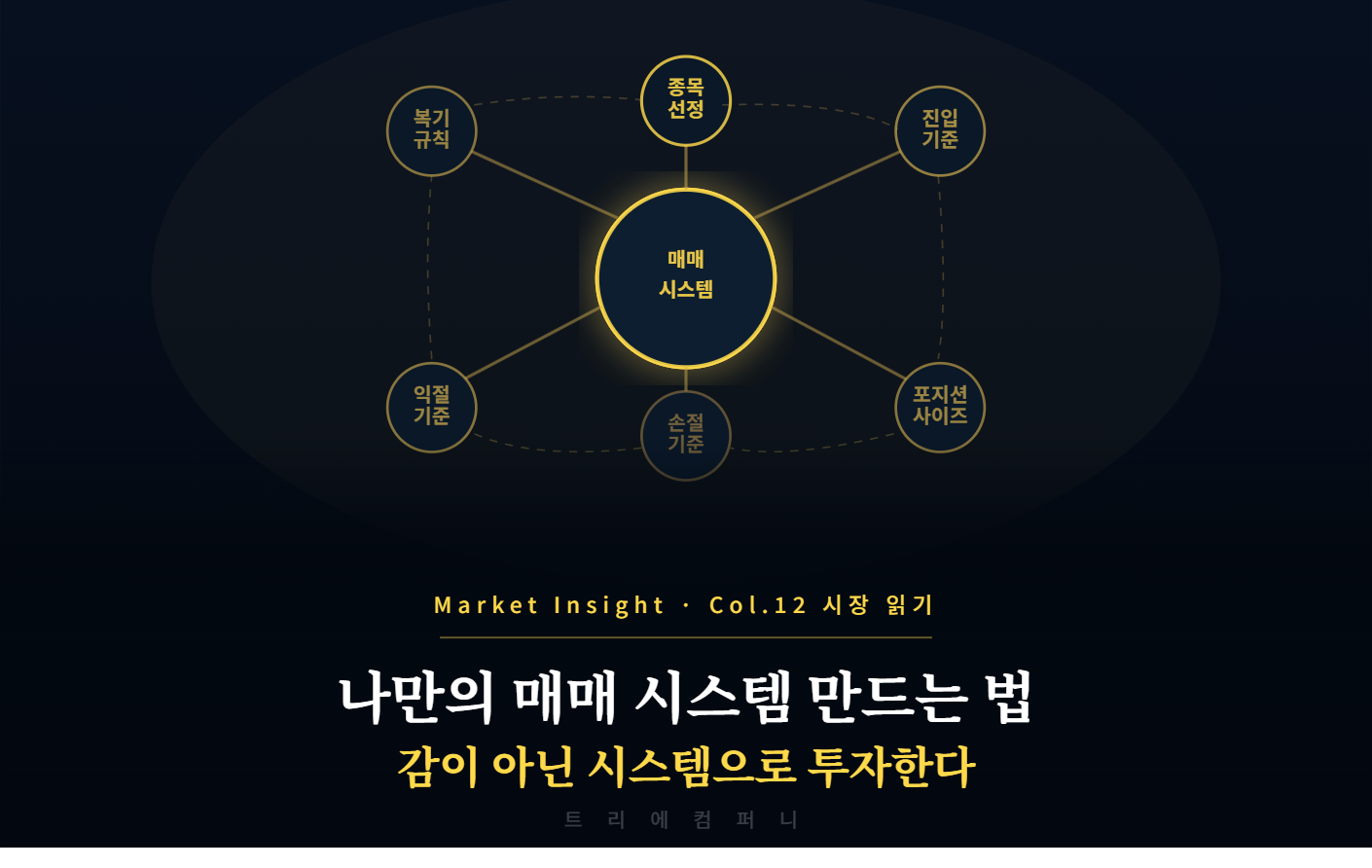 Market Insight · Col.12 시장 읽기나만의 매매 시스템 만드는 법감이 아닌 시스템으로 투자하는 사람만 꾸준히 살아남는다. 개인 투자자가 직접 만들 수 있는 매매 시스템의 구성 요소트리에컴퍼니 Market Insight — 시장 칼럼 읽는 시간 약 6분나만의 매매 시스템을 갖춘 투자자와 그렇지 않은 투자자의 차이는 시간이 지날수록 벌어집니다. 매번 "이 종목 살까 말까"를 처음부터 고민하는 사람과, "내 시스템에 맞으면 산다"는 기준을 가진 사람은 판단 속도, 감정 개입 정도, 장기 수익률이 모두 다릅니다. 매매 시스템은 어렵지 않습니다. 지금 무의식적으로 하고 있는 판단들을 명문화하는 것에서 시작합니다.✦매매 시스템이란 무엇인가매매 시스템이란 종목 선정부터 진입, 보유, 청산까지의 판단 ..