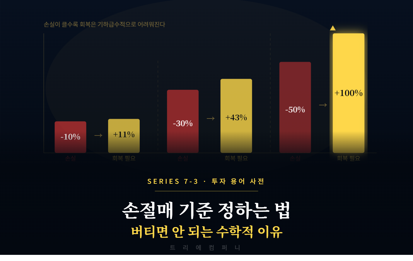 Series 7-3 · 투자 용어 사전손절매 기준 정하는 법알면서도 못 지키는 것이 손절이다. 감정을 이기는 것이 아니라 구조로 만드는 법을 정리합니다트리에컴퍼니 시리즈 7편 — 투자 용어 읽는 시간 약 5분손절매 기준을 정하는 법을 모르는 투자자는 없습니다. 하지만 실전에서 지키는 투자자는 드뭅니다. 손절은 지식의 문제가 아닙니다. 매수 전에 기준을 세우고, 그 기준이 왔을 때 감정 없이 실행하는 구조의 문제입니다.✦손절매란 무엇인가손절매(Stop Loss)는 손실이 더 커지기 전에 보유 종목을 매도하는 행위입니다. 손실을 확정하는 것이 아닙니다. 더 큰 손실을 막기 위한 리스크 관리 행동입니다.많은 투자자가 손절을 "실패의 인정"으로 느낍니다. 그래서 버팁니다. 하지만 -10%를 손절하지 않아서 -4..